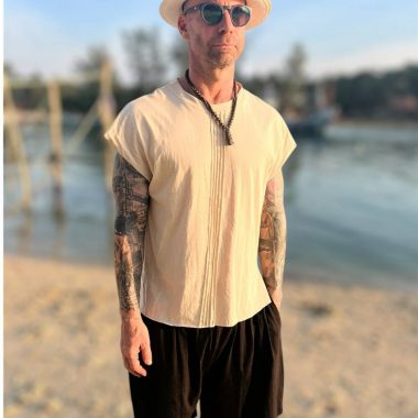 Slim fit shirt featuring lapel collar and long sleeves with buttoned cuffs. Front button closure.
